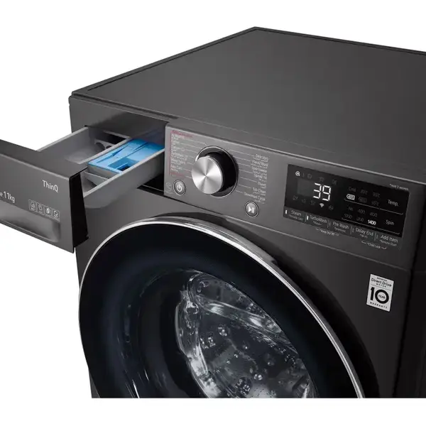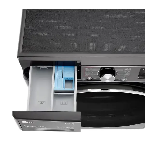 قسمت جاپودری و مایع شوینده در سمت چپ قرار دارد و در کنار آن لوگوی برجسته ال جی و نشان 10 سال گارانتی موتور به چشم میخورد.