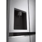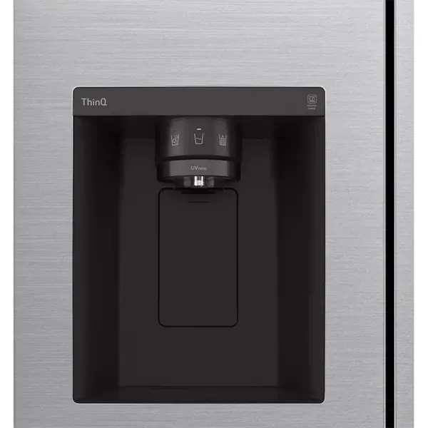 بر روی درب سمت چپ (درب فریزر)، آبسردکن اتوماتیک تعبیه شده است. این آبسردکن با طراحی مینیمال خود هم از لحاظ ظاهری هماهنگ با بدنه دستگاه است و هم از لحاظ کاربری، عملکرد سریع و دقیقی ارائه میدهد. نکته قابل توجه این است که این مدل از قابلیت InstaView (یعنی پنجره شیشهای قابل ضربه برای نمایش داخل یخچال) پشتیبانی نمیکند. اما با وجود طراحی دور این دور و نمای شیک سیلور، همچنان جذابیت ظاهری خود را حفظ کرده است.